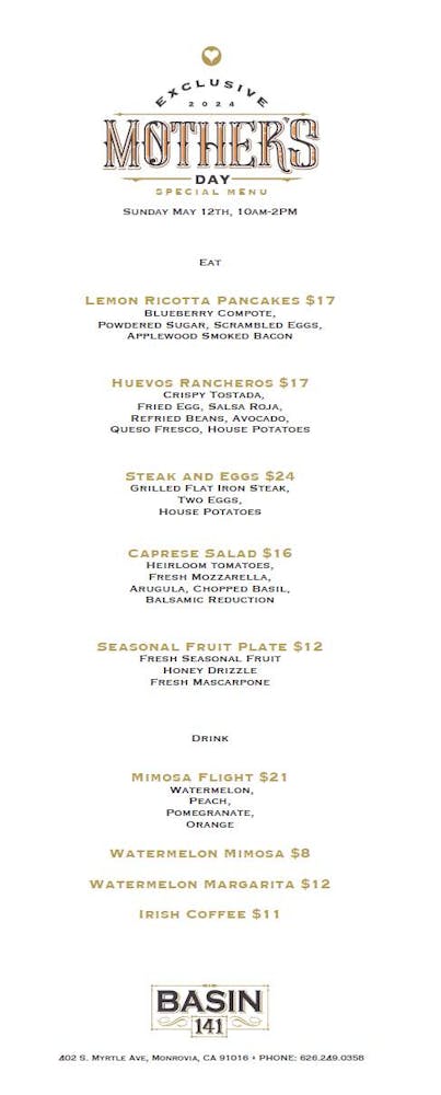 Come join us on Sunday May 12th for a special Mother's Day Brunch. Time to treat your mom to some Lemon Ricotta Pancakes and a Watermelon Mimosa. Check out the Menu!